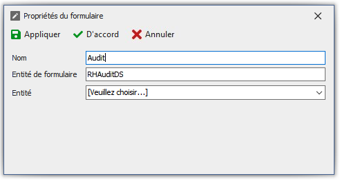 3. Laissez le champ Entité vide. L’entité sera créée automatiquement lorsque l’utilisateur enregistrera le concepteur de formulaire.