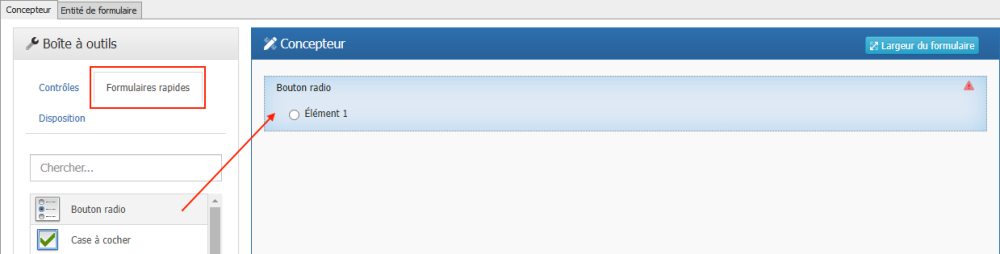 Une fois dans le Concepteur de Formulaires, pour créer les attributs, il suffit à l’utilisateur de glisser-déposer le champ désiré à partir de l’onglet formulaires rapides, qui sera utilisé dans le formulaire. Le libellé donné au champ, sera ensuite utilisé pour créer les attributs.