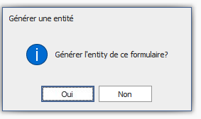 1. « Générer l’entité de ce formulaire ? », l’utilisateur doit répondre oui, pour créer l’entité et ses attributs. Sinon, le formulaire ne les enregistrera pas et ne les créera pas.