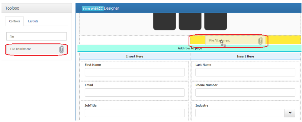1. By holding the left mouse button on the control of the attachment in the control list, and then dropping the mouse in the row or cell, the control is inserted in the yellow column.