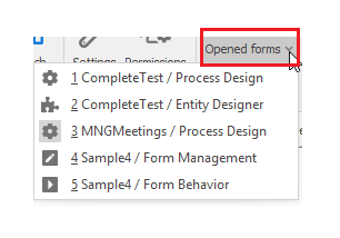 Selecting the Opened Forms dropdown will release a list of all windows/tabs in the Admin Console that are currently open.
