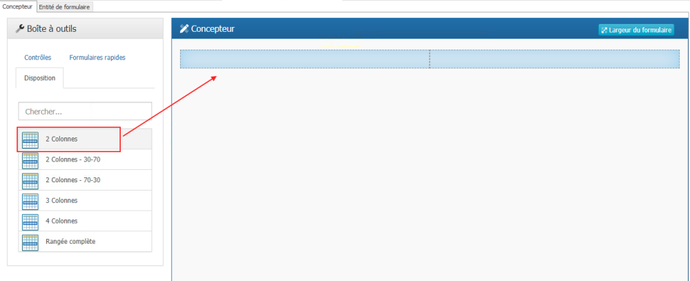 Pour insérer une colonne, sélectionnez d’abord la mise en page dans la liste en maintenant le bouton gauche de la souris enfoncé, puis déposez-la dans l’en-tête de la conception du formulaire à l’emplacement souhaité (la zone sera marquée en jaune). La suppression d’une colonne dans la section « Ajouter une ligne à la page » ajoutera une ligne à la page avec le nombre approprié de colonnes.