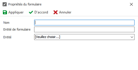 Entité : Si l’utilisateur a besoin de stocker des informations de formulaire dans une base de données, une entité associée au formulaire doit être sélectionnée dans cette liste.
