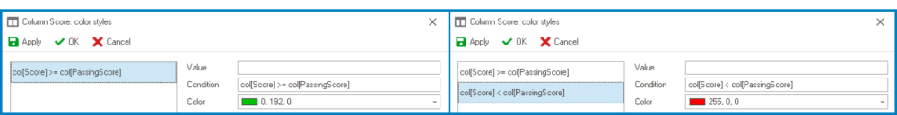 - In the grid below, a user would like to compare values inside the Score column with those in the Passing Score column.