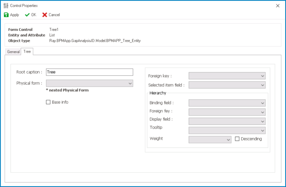 - Weight: This is a single-select dropdown field that retrieves the list of attributes available in the associated entity. It allows users to select the attribute representing the weight or priority of the nodes in the tree control.
