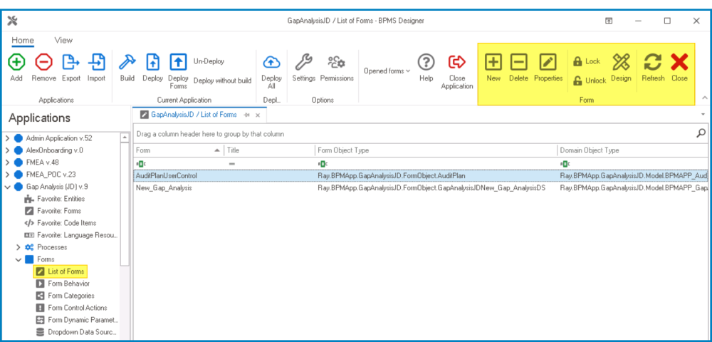 - From the Application Tree, navigate to Forms > List of Forms (double-click to open). It will display the List of Forms tab and expand the menu bar to show additional options.