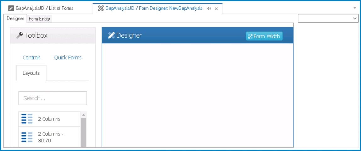 Within the Form Designer, there are two tabs available to users: Designer and Form Entity.