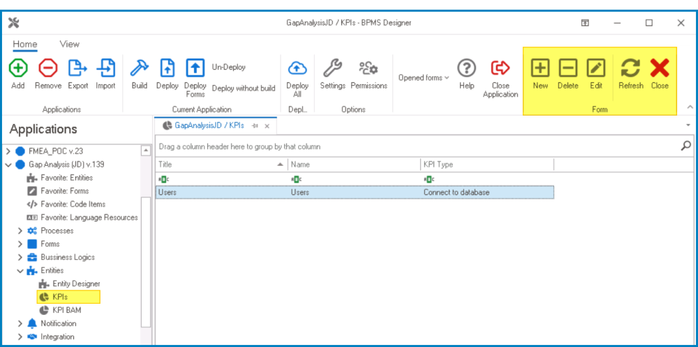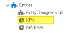 - From the Application Tree, navigate to Entities > KPIs (double-click to open). It will display the KPIs tab and expand the menu bar to show additional options.