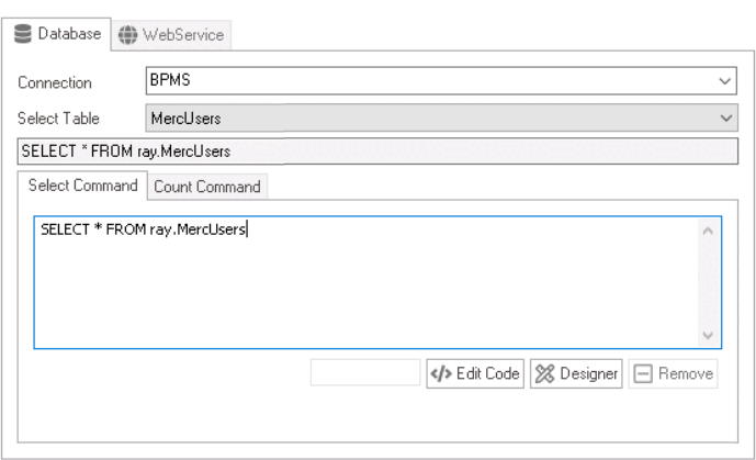 - Edit Code: This button allows users to launch the Code Designer, in which users can write code specifying custom functions or methods to manipulate the data retrieved by the SQL query.