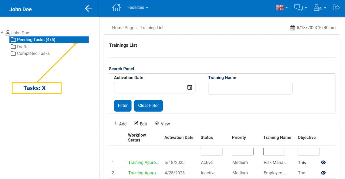 In the DBP web application, when a task or workflow is triggered by code from a grid, recipients must manually refresh the page to see an increase in the number of tasks within the Pending Tasks folder. This behavior is applicable only when recipients are already logged into the system.