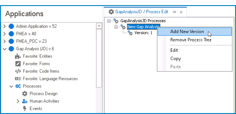 - In the Process Edit tab, right-click on the desired process and select the Add New Version option.