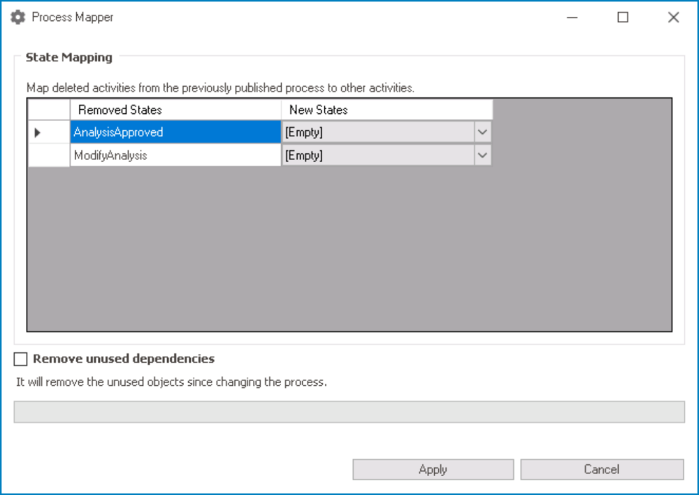 As mentioned in this window, state mapping refers to the practice of connecting deleted activities from the previously published process to new activities in the modified process. By selecting a new state for a removed one, the content of the removed state will be transferred to the new state.