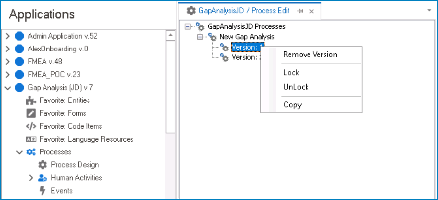 - Once pasted, the process version will be displayed below the last version in the tree.