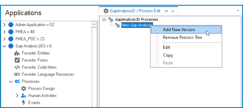 - Next, in the Process Edit tab, right-click on the newly defined process and select the Add New Version option.
