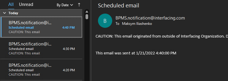 The BPMS core executes the defined event action and sends an email.