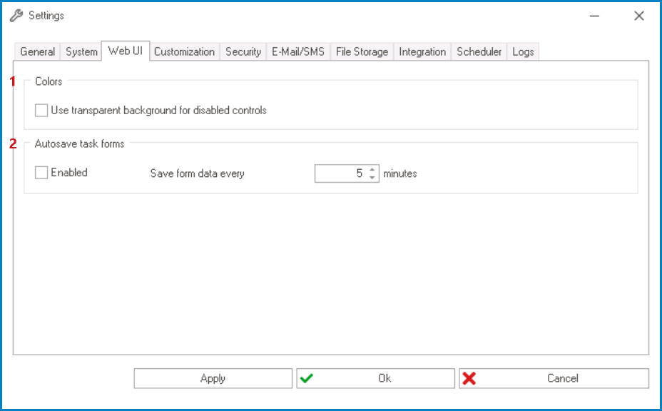 - Save Form Data: This is a numeric updown field that allows users to set the interval at which the application automatically saves task forms. Users can enter this number either manually or by using the increment/decrement arrows.