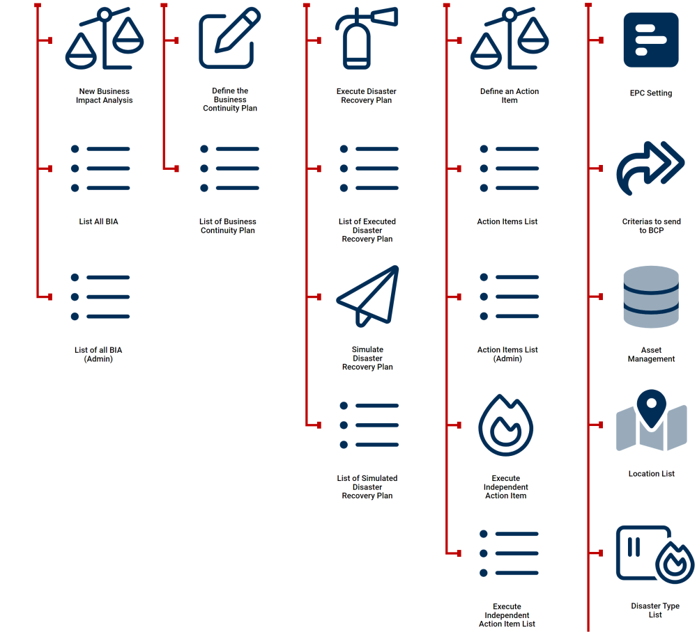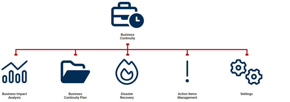 - This menu map illustrates the organization of forms in the Business Continuity category, which is a top-level category in the web application. Under this category, there are five subcategories: Business Impact Analysis, Business Continuity Plan, Disaster Recovery, Action Items Management, and Settings. The number of forms within each subcategory is as follows: Business Impact Analysis (3), Business Continuity Plan (2), Disaster Recovery (4), Action Items Management (5), and Settings (7). This hierarchical structure helps users to easily locate and manage their forms based on their specific needs.