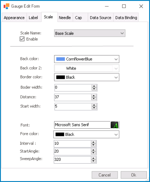 In the Scale tab, users can customize various properties related to the scale of the gauge control.