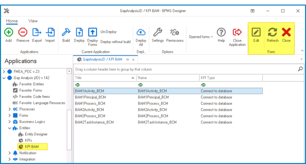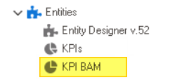 - From the Application Tree, navigate to Entities > KPI BAM (double-click to open). It will display the KPI BAM tab and expand the menu bar to show additional options.