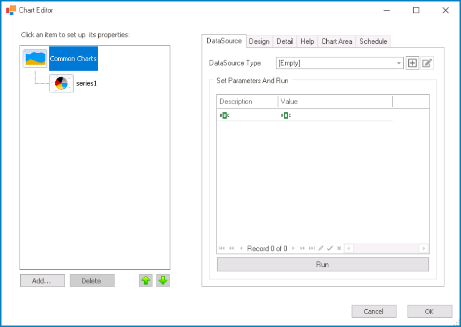 - If the selected data source has a parametric query (i.e., a query that contains parameter placeholders), users can enter the parameter names in the Description column and the corresponding values for the parameters in the Value column.