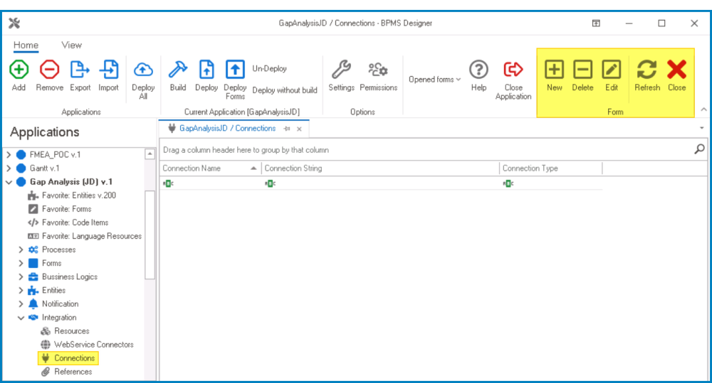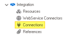 - From the Application Tree, navigate to Integration > Connections (double-click to open). It will display the Connections tab and expand the menu bar to show additional options.