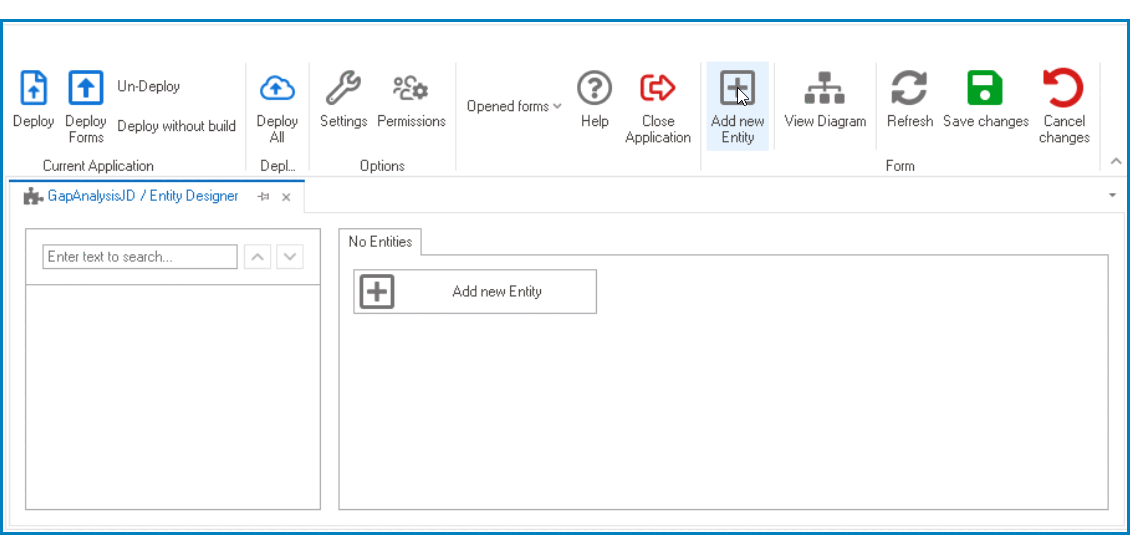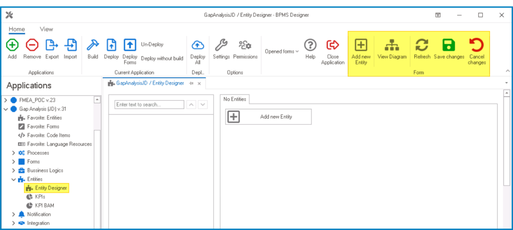 - From the Application Tree, navigate to Entities > Entity Designer (double-click to open). It will display the Entity Designer tab and expand the menu bar to show additional options.