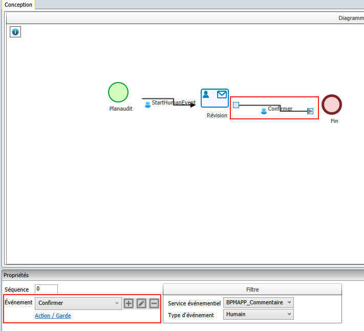 2. Sélectionnez la transition/le connecteur (←) entre les deux activités dans la section Diagramme de processus, puis modifiez, créez et supprimez des événements dans la boîte de dialogue des événements.