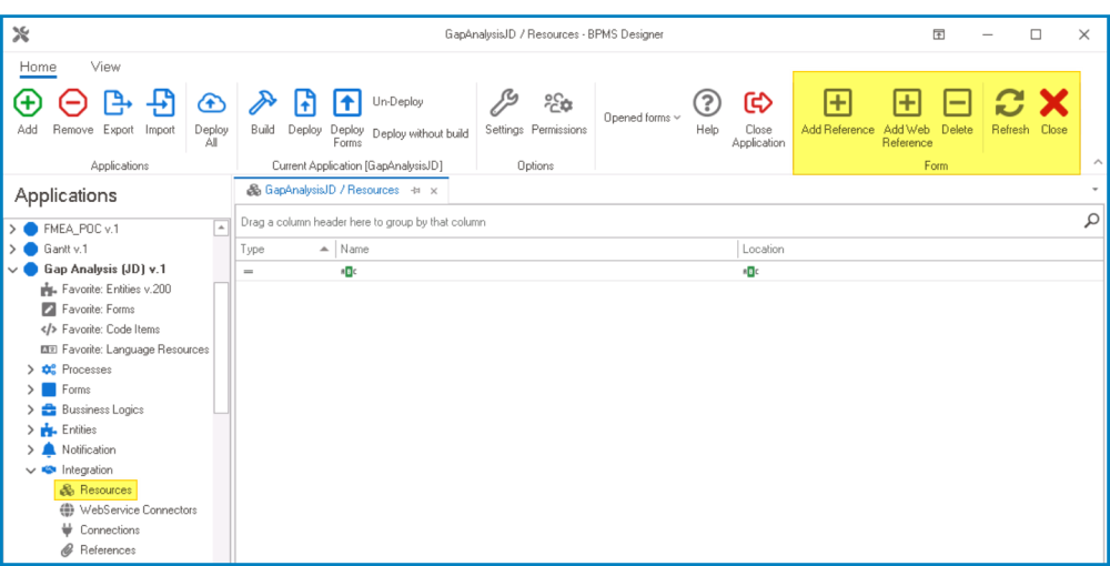 - From the Application Tree, navigate to Integration > Resources (double-click to open). It will display the Resources tab and expand the menu bar to show additional options.