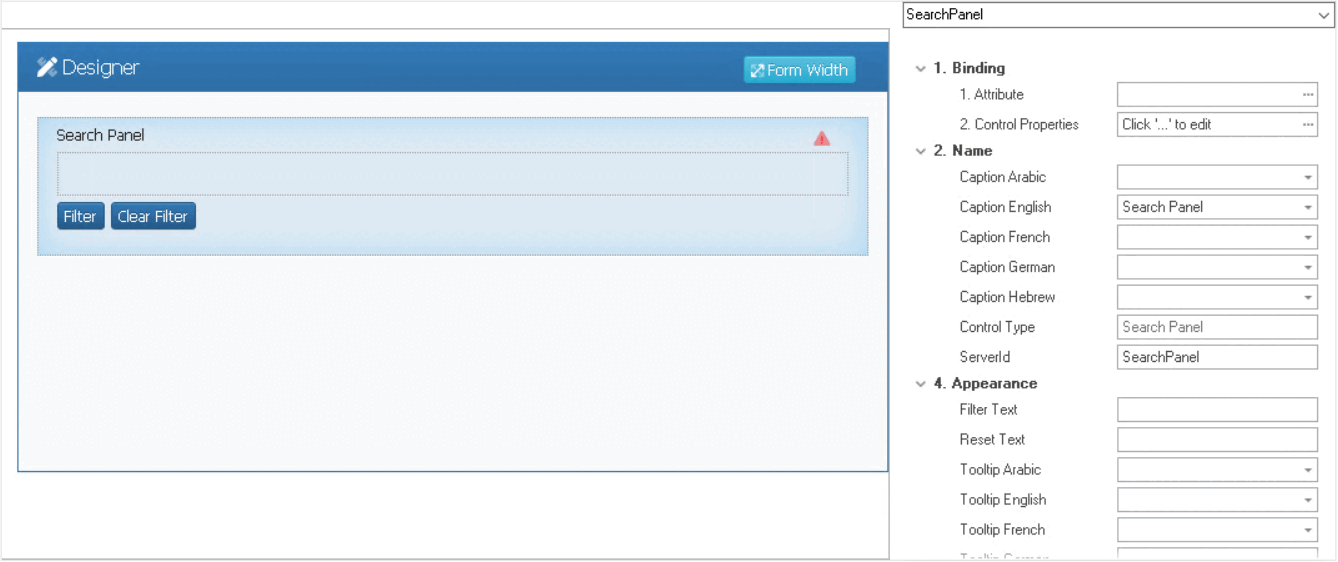 When a search panel control is selected in the design environment, its associated properties are displayed in the Control Properties panel.