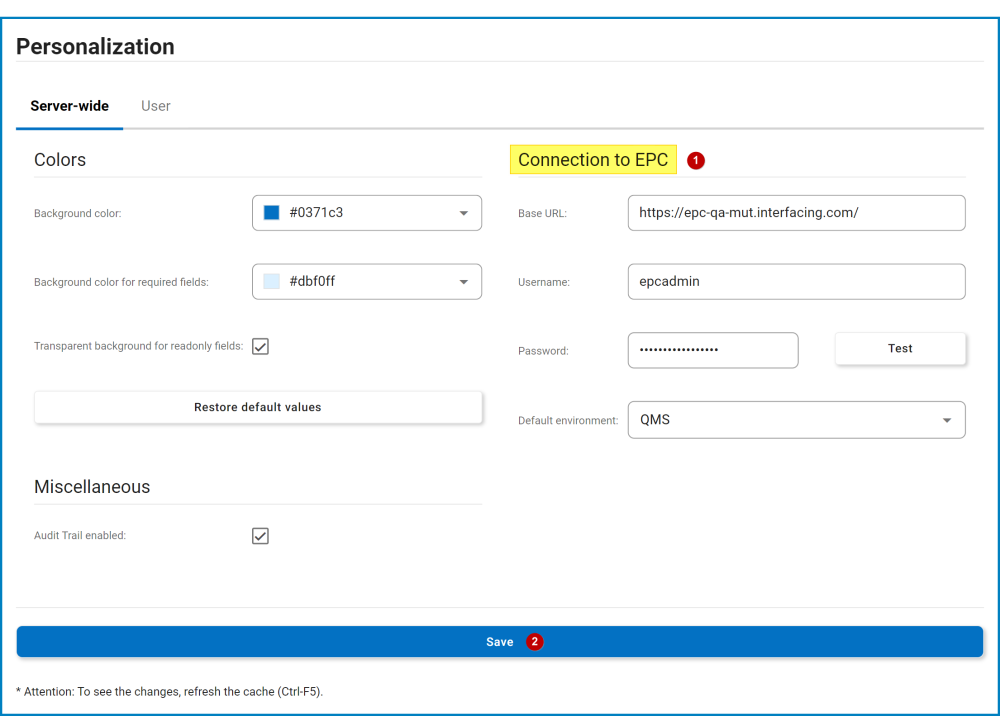 - In the Personalization form, under the Connection to EPC category, set up a connection to the specified EPC server.