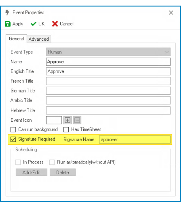- In the Process Designer, select the human event (transition arrow) for which you want to require a signature.