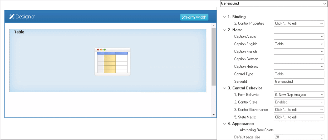 When a table control is selected in the design environment, its associated properties are displayed in the Control Properties panel.