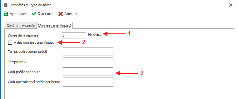 Déterminer le délai de réponse et le temps et le coût d’exécution d’une tâche dans l’onglet « données analytiques » est une fonction qui peut être utilisée pour préparer des rapports pour analyser les activités existantes de l’organisation à l’aide de l’outil de génération de rapports (ARPG). Les détails de l’onglet « données analytiques » sont entièrement décrits dans l’image ci-dessous, qui est accessible en éditant ou en créant une tâche.