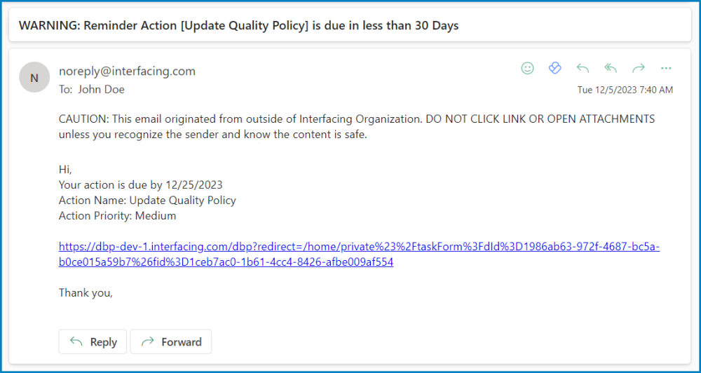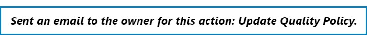 - For each action, an email is sent to the assigned owner, providing details about the action and a reminder of its impending due date.