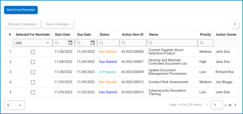 - Send Email Reminder: This button allows users to trigger email reminders for the selected actions.