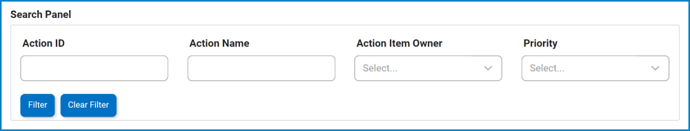 - Action Item Owner: This is a single-select dropdown field that allows users to filter by action item owner.