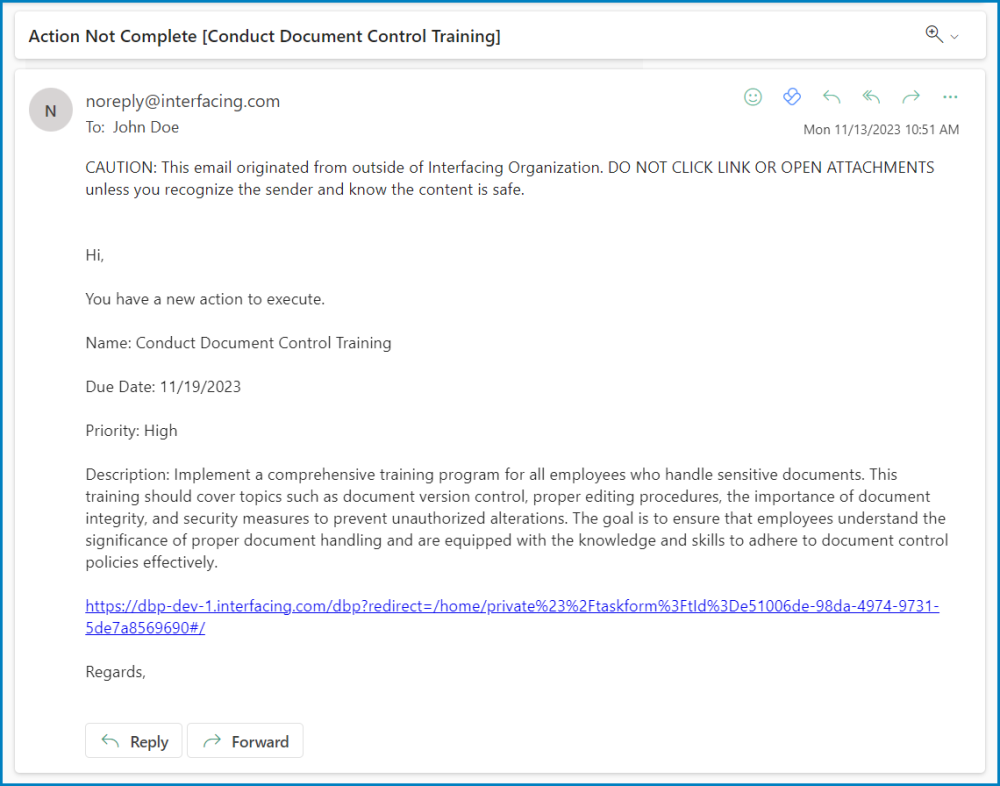 Clicking on either the subject in Pending Tasks or the link in the email will direct the user to the Action Not Complete form. This form displays all information entered in the Execute the Action form, allowing users to make necessary modifications. Listed below are the other notable features in the form: