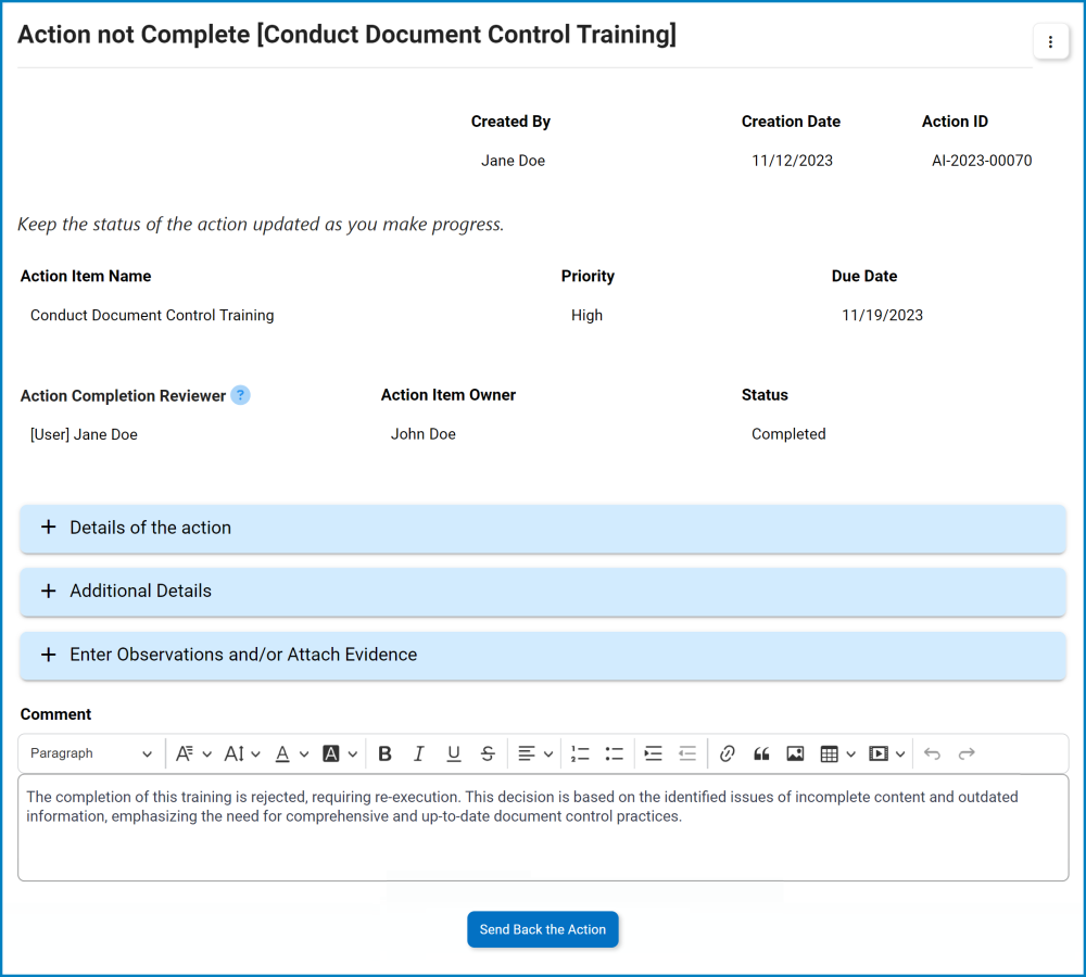 If an action item is rejected, its assigned owner will receive a notification in their Pending Tasks informing them that the action has been deemed incomplete.