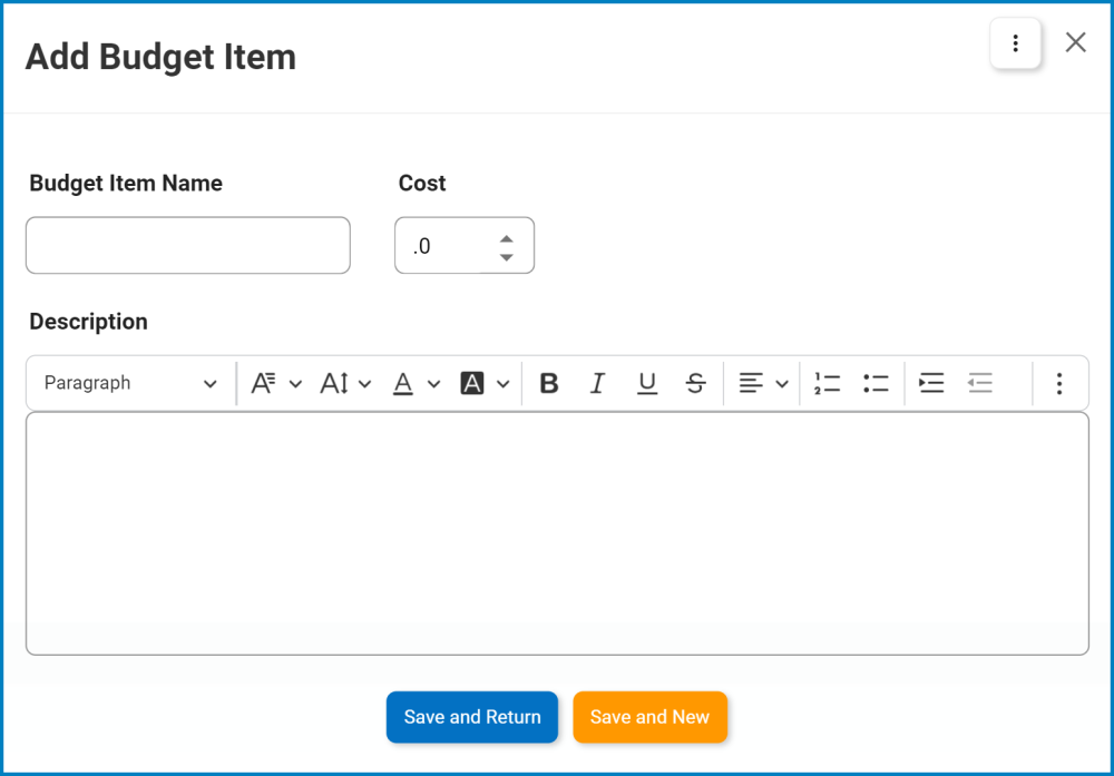 - Description: This is a rich text field that allows users to provide a description for the budget item.