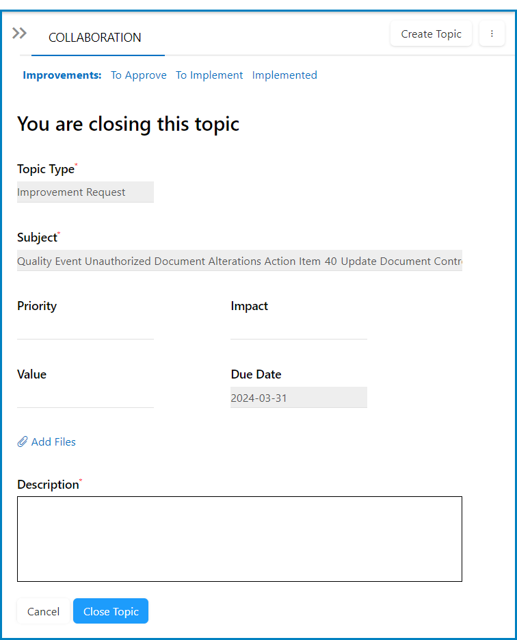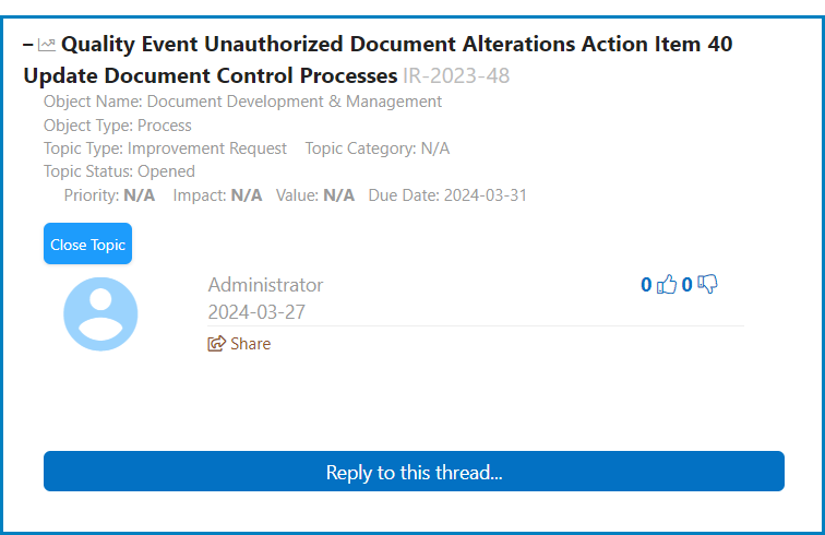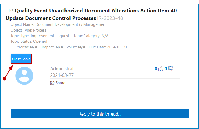 - Close Topic: This button allows users to close the topic/IR.
