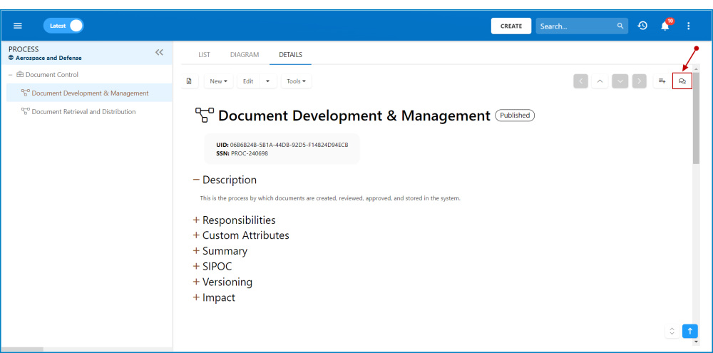 - Once you have either found or been directed to the object in EPC, click on the Collaboration button (indicated by the arrow):