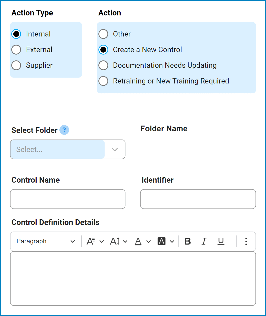 When users select the Create a New Control option in the New Action form, specific fields related to this action will appear. These fields allow users to specify the EPC folder where the control will be created and, if desired, to provide a name, identifier, and description for the control.