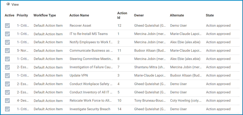 - To view, select the action item that you want to view from the grid and click on the View button. In viewing mode, users cannot make any modifications. They can, however, perform Excel-related activities (export, import, and create an Excel template).
