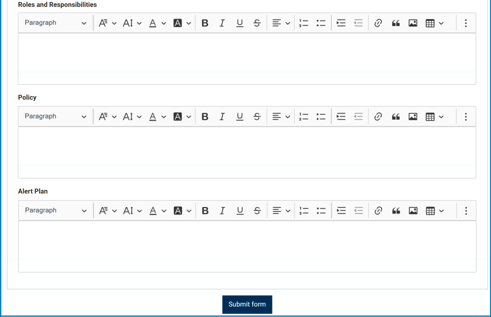 The BC Overview tab of the BCP is broken into 7 sections: (1) Summary; (2) Terms and Definitions; (3) Purpose, Goal/Objective; (4) Scope; (5) Roles and Responsibilities; (6) Policy; and (7) Alert Plan. These sections are all description boxes that allow users to input information about the BCP. In these fields, users can insert headings, bullets, images, tables, links, and media files (as well as change font colors, font sizes, background colors and more).