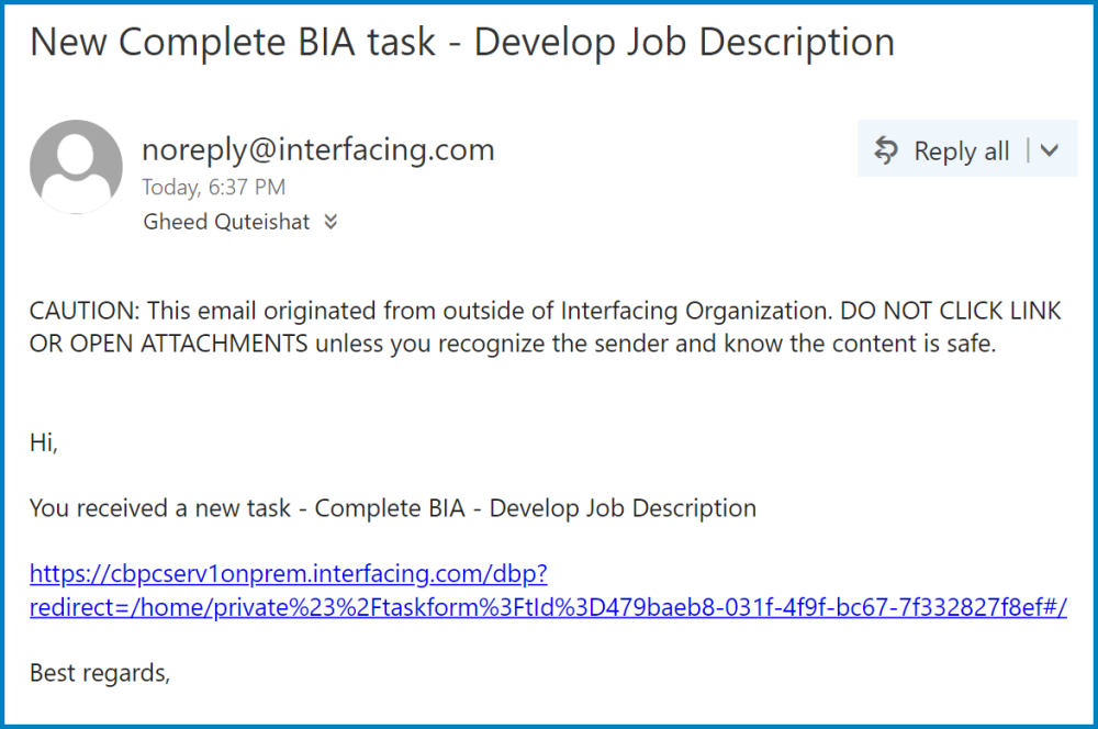 Clicking on either the subject in Pending Tasks or the link in the email should direct the assignee to the Complete BIA form. This form is composed of 6 tabs:
