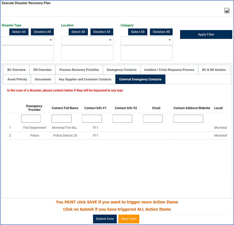 The External Emergency Contacts tab is specific to the external parties that need to be contacted in the event of a disaster.