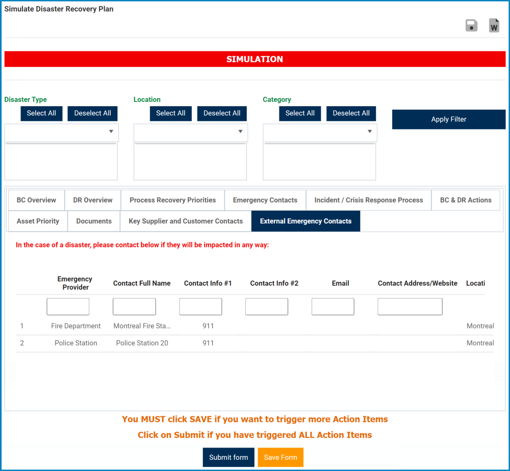 The External Emergency Contacts tab is specific to the external parties that need to be contacted in the event of a disaster.