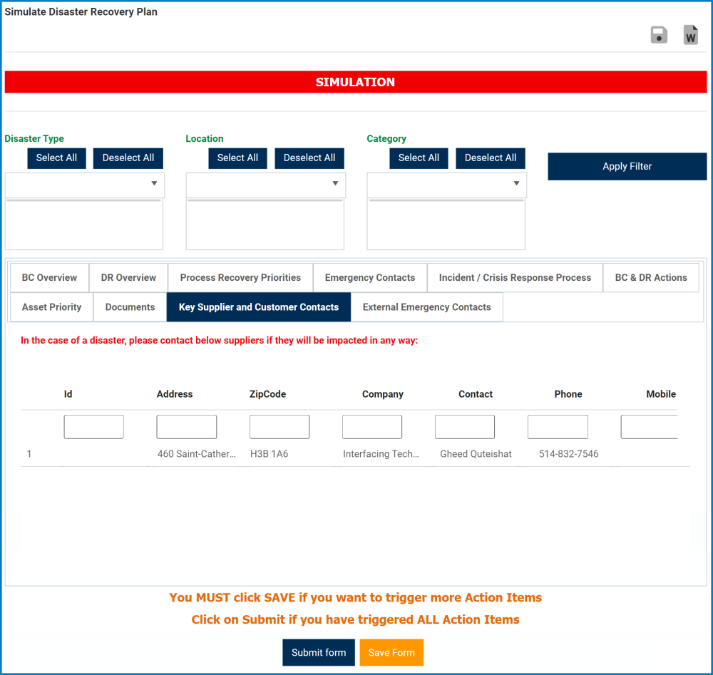 In the Key Supplier and Customer Contacts tab, users can access the list of suppliers and customers with their contact information. Should a disaster occur, users need to contact the suppliers and customers that may be impacted in some way.