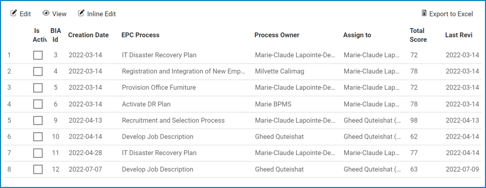 Only users with administrative rights can access this section of the BCM application. Similar to the List All BIA module, here, administrators can access a list of all BIAs created. (These BIAs can be in the approval cycle or already approved.) Unlike the previous section, however, not only can administrators view these BIAs but they can also edit them and determine whether or not they are active.