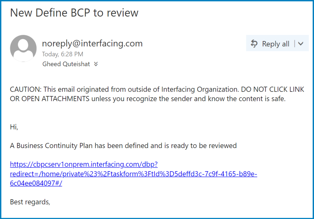 They will also receive an email informing them that a BCP has been defined and is ready for review.